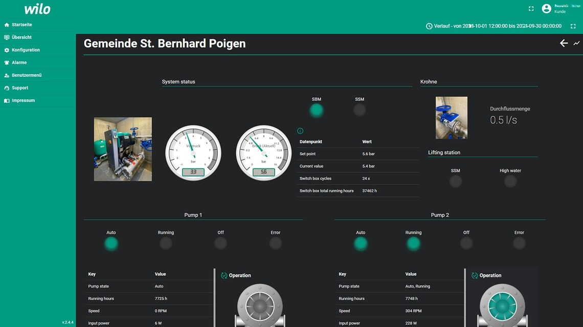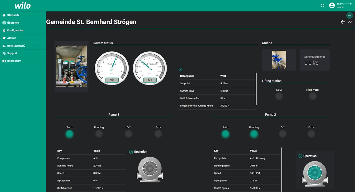 Der Wilo‑Monitor überwacht die Pumpenanlagen in den Ortteilen Poigen und Strögen in Echtzeit. Bei einer Störung erhalten Betreiber sofort eine Benachrichtigung – zum Beispiel direkt aufs mobile Endgerät –, um Ausfallzeiten zu vermeiden. In der Webanwendung bleiben alle wichtigen Betriebsdaten im Blick, mit individuell anpassbaren Dashboards für maximale Übersicht.