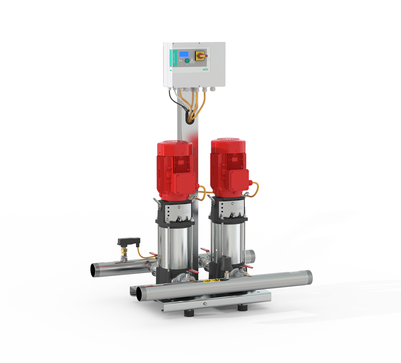 Une ou deux pompes multicellulaires verticales non autoamorçantes avec moteur électrique, RAL 3000. Étanchéité d'arbre par garniture mécanique de série. Collecteur d'aspiration et de refoulement de chaque pompe : avec clapet antiretour, vanne d'arrêt côté aspiration et refoulement, capteur de pression et interrupteur de débit, manomètre pour la commande automatique du système. Équipé de série d'un contrôleur d'isolement chargé de contrôler en permanence l'isolation du moteur de la pompe contre la terre.