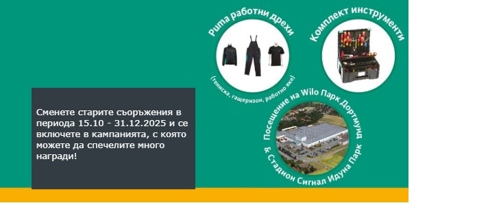 Сменете всички стари, класически съоръжения и помпи от всяка марка, използвани за ОВК или ВиК инсталациите с високо енергийно ефективни Wilo продукти, и можете да спечелите много награди!