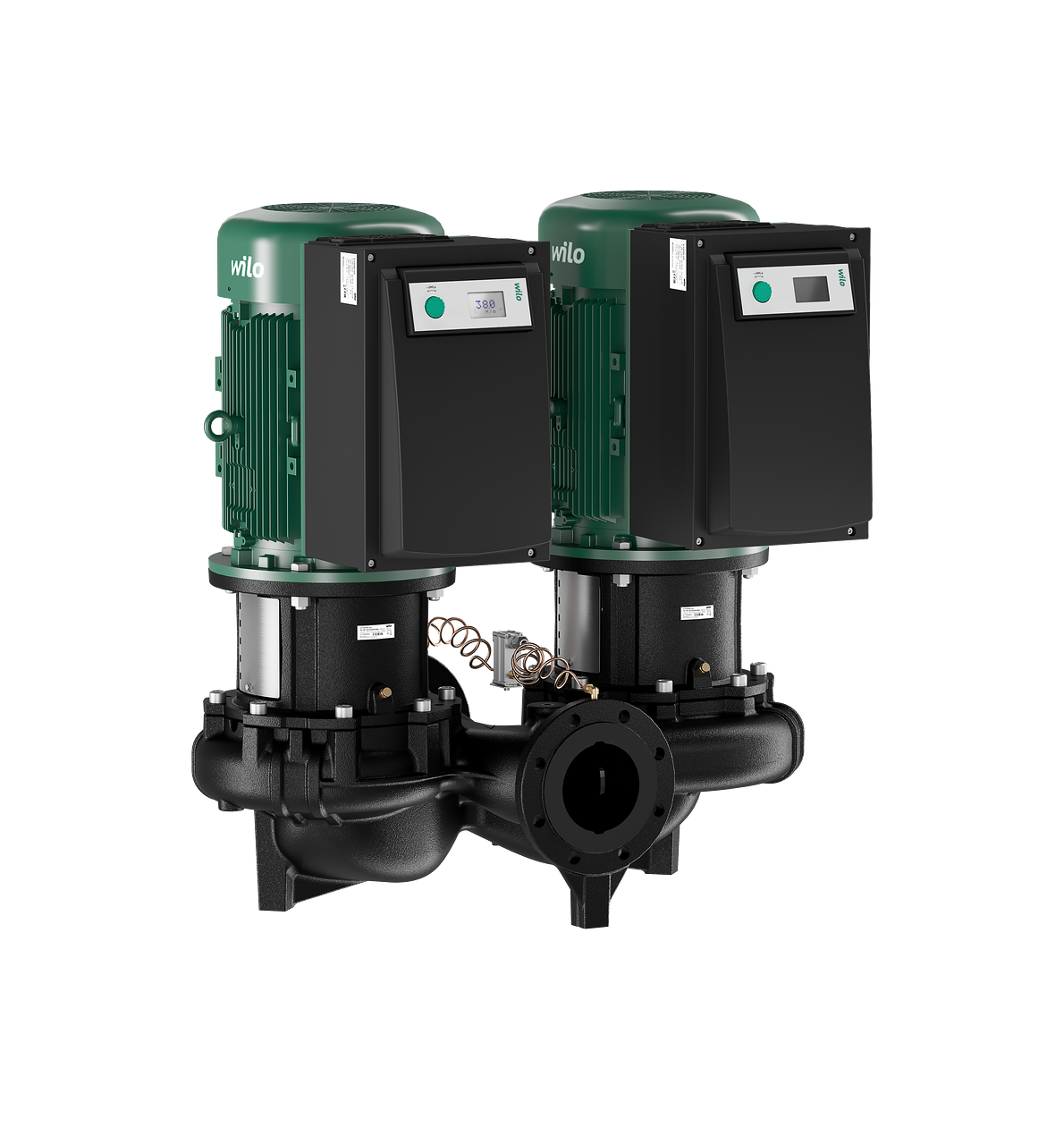 Glanded twin-head pump with in-line design for pipe installation or installation on a base with built-in frequency converter for electronic control for constant or variable differential pressure (Δp-c/Δp-v), among other things.