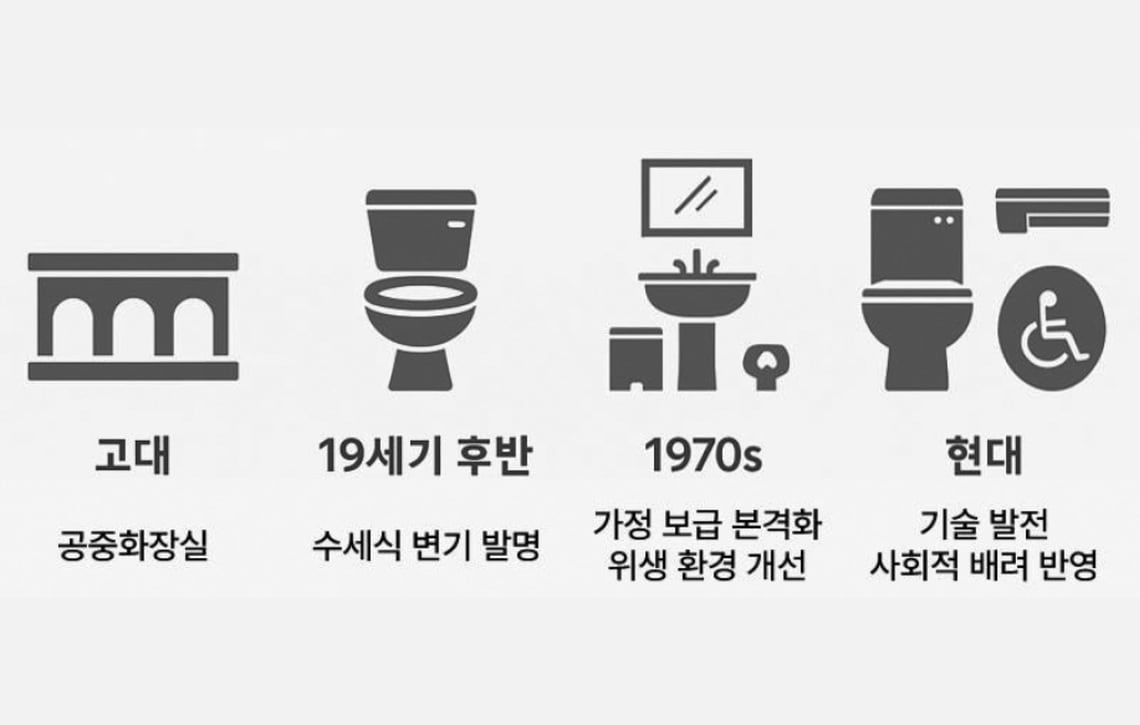 화장실은 현대 사회의 필수적인 위생 시설로 인류와 함께 발전해 온 공공시설이다. 옛 고대 로마 시절부터 발달 된 하수 시설을 갖춘 화장실이 존재 하였으며, 19세기 후반 수세식 변기가 발명되면서 화장실 사용이 일반화되었고, 일제 강점기 이후 도시 내 관공서, 호텔 등에 좌변기가 보급되었다. 특히 1970년대에는 경제 개발과 함께 일반 가정의 수세식 화장실 설치가 본격화되면서 위생환경이 크게 개선되었고, 욕조, 세면대 등 위생 설비도 함께 추가 되면서 가정 내 화장실 문화가 발전하게 되었다. 현재에 이르러서는 전자, IoT 기술의 발전으로 비데, 자동 물 내림 변기 등 다양한 기능이 추가 되었고, 친환경 화장실, 장애인 화장실 등 사회적 약자를 위한 배려가 반영된 화장실도 볼 수 있다(<그림 1>).