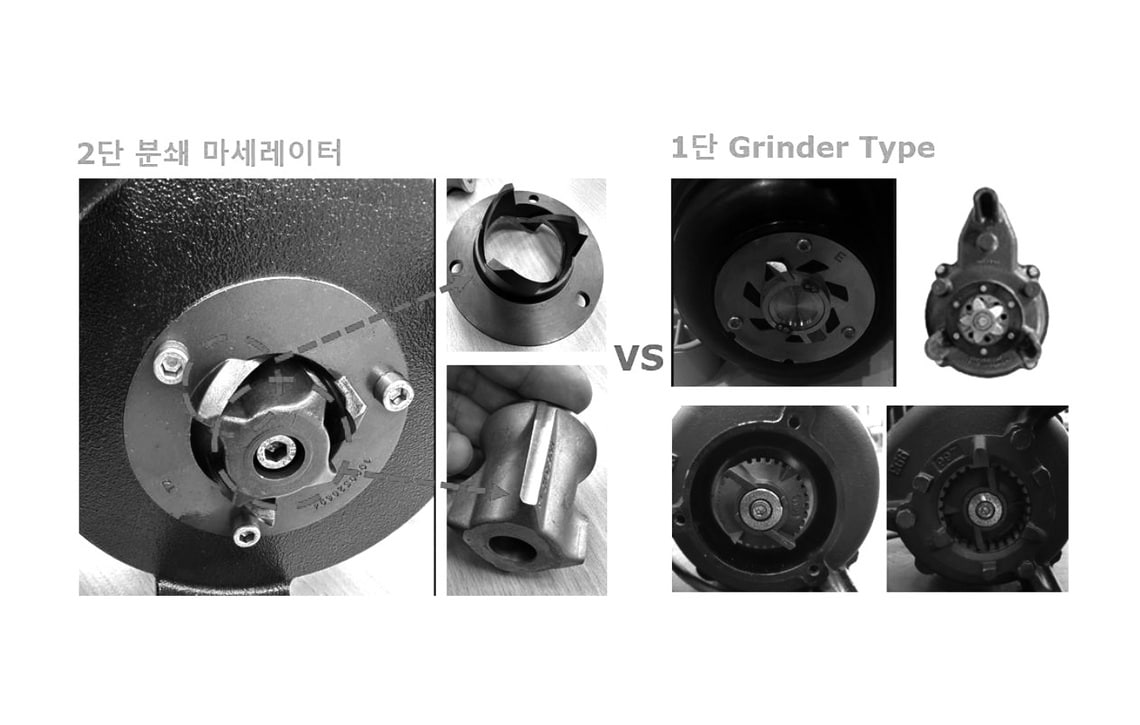 2단 분쇄 마세레이터는 기존의 일반적인 1단 그라인더 타입의 펌프에 비해 효율적으로 고형물을 파쇄하여 막힘없이 작동하는 오배수펌프의 기술력을 보여준다. (<그림 8>).