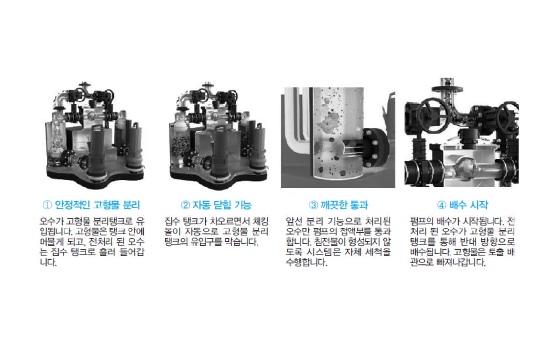 이 제품은 오수 속에 섞여 들어온 고형물들을 특허를 받은 기술을 통해 걸러주어 막힘 현상과 펌프 고장을 예방해 주는 고형물 분리 기술이 특징이다. 오수 속에 섞여 들어온 물티슈, 위생용품, 속옷 등 일반 배수 패키지로는 처리가 어려운 오물들을 분리하여 배출하기 때문에 막힘 현상과 펌프 고장을 예방한다. 이를 통해, 정기적인 펌프 수리 및 역류 오수 청소 등에 소요되는 비용과 인력 손실 등을 절감할 수 있다(<그림 10>).