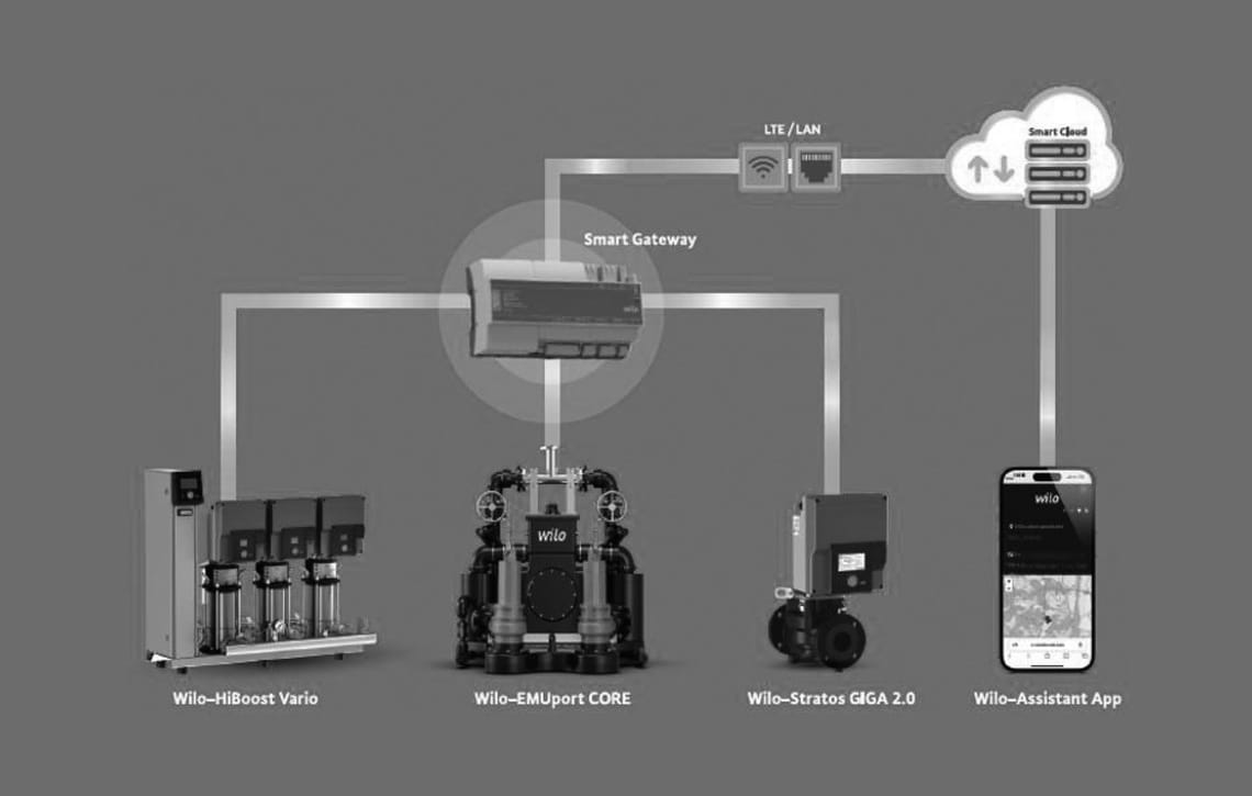“Wilo Service Solution”은 기존 유지보수 서비스에 스마트 게이트웨이(Smart Gateway), 스마트 클라우드 (Smart Cloud), 원격 모니터링 시스템을 더해 디지털 기반의 유지보수 솔루션을 제공하고 있다. 펌프의 작동 상태는 스마트 게이트웨이를 통해 스마트 클라우드에 안전하게 저장되며, 펌프에 이상이 발생하면 알람 기능과 실시간 원격 모니터링을 통해 펌프 및 시스템을 전문적이고 효율적으로 관리한다. 스마트 제어 시스템이 적용됨으로써 사고를 예방하고 유지보수 비용 절감 효과를 누릴 수 있다(<그림 12>).