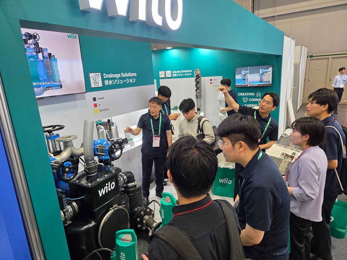 전시 기간 동안 약 300명 이상의 고객이 부스를 방문해 제품 상담과 기술 설명을 받았으며, 방문객들의 관심과 반응이 뜨거웠다. 특히 일본 시장에서는 여전히 구형의 습식 오배수 시스템이 주류를 이루고 있어, 유지관리 효율성과 위생성을 모두 개선할 수 있는 건식 고형물 분리 방식의 ‘Wilo-EMUport CORE’에 이목이 집중됐다. 부스에서 직접 제품 구조와 작동 원리를 확인한 방문객들은 기존 시스템 대비 탁월한 유지보수 편의성과 내구성, 그리고 실시간 상태 점검과 이상 발생 시 즉각 대응이 가능한 스마트 모니터링 기능에 큰 호응을 보였다.