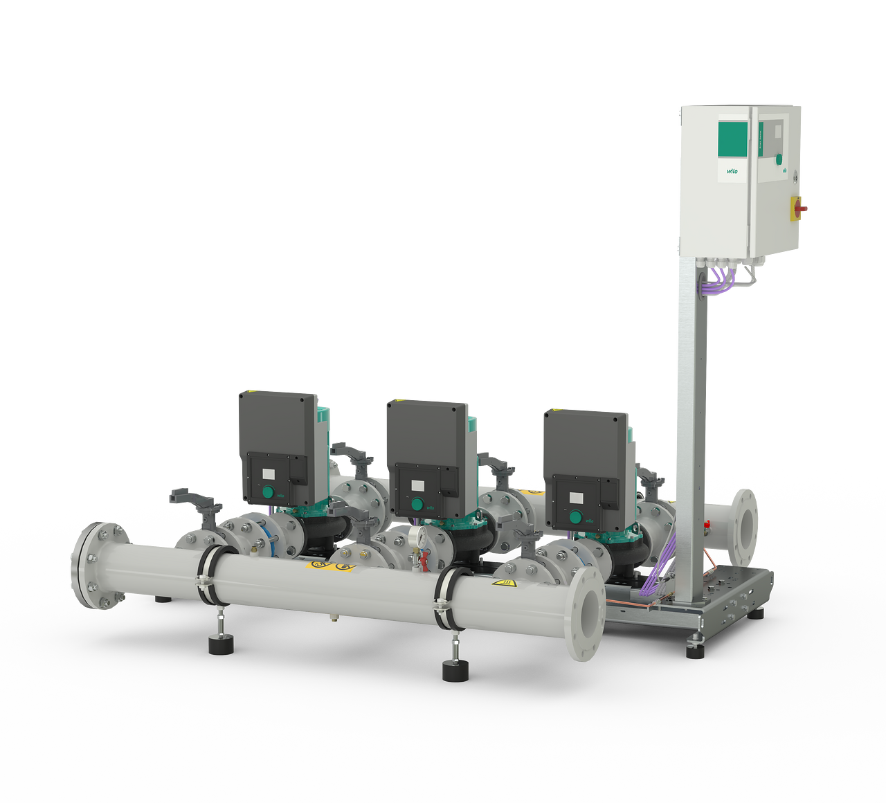 Високоефикасна, целосно автоматизирана постројка со повеќе пумпи подготвена за приклучување за реализирање на поголем волумен кај системи за греење, ладна вода и постројки за ладење. 3 до 4 паралелно поврзани, електронски регулирани Inline-пумпи во изведба со сув ротор од серијата Yonos GIGA2.0-I. Од нив по една пумпа е резервна пумпа. Вкл. Smart-Controller SCe.