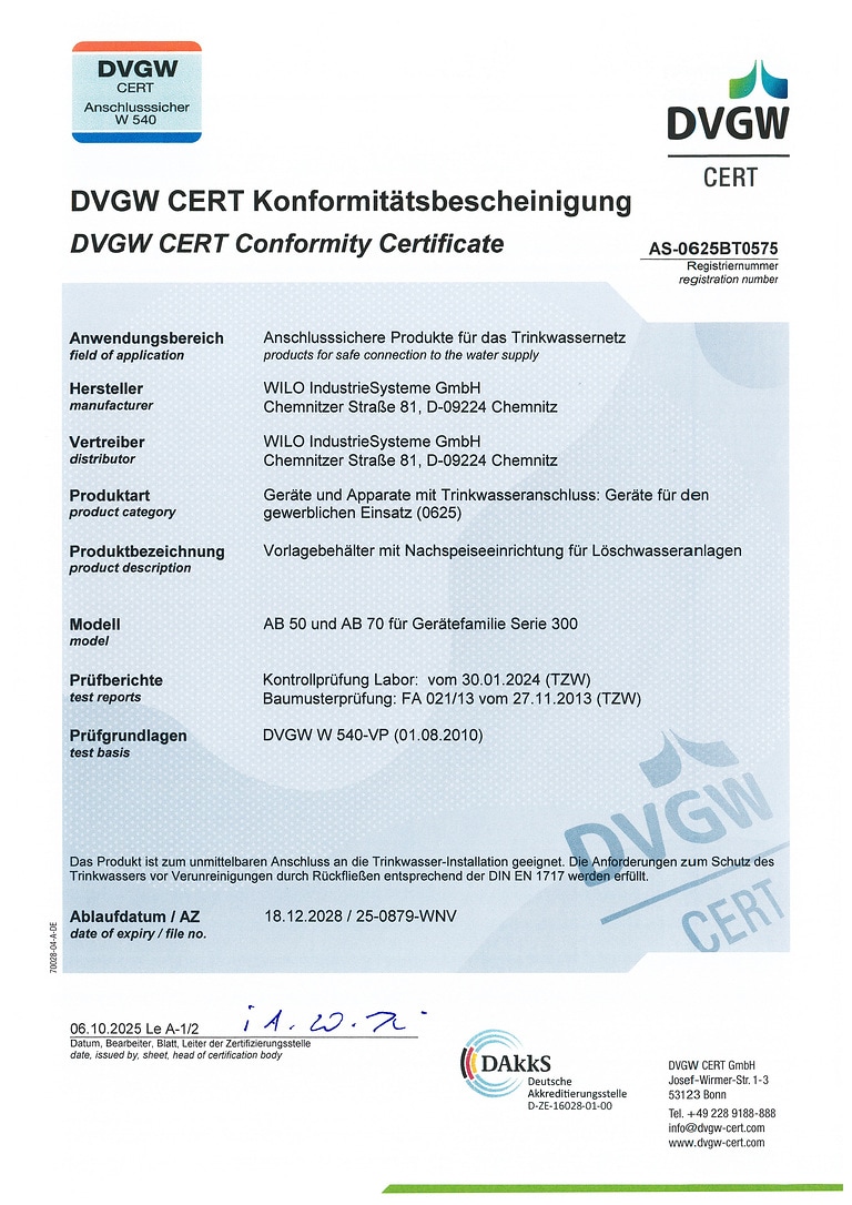 Prüfgrundlagen: DVGW W 540-VP (01.08.2010)